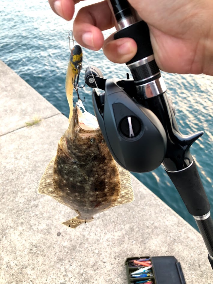 リフトアンドフォールで探っていると結構足元のところで何かがヒット!明らかに軽い引きなので多分エソなんじゃないのか?と思いながら巻いてきたらヒラメじゃねえか!エソよりはいいのが釣れた!