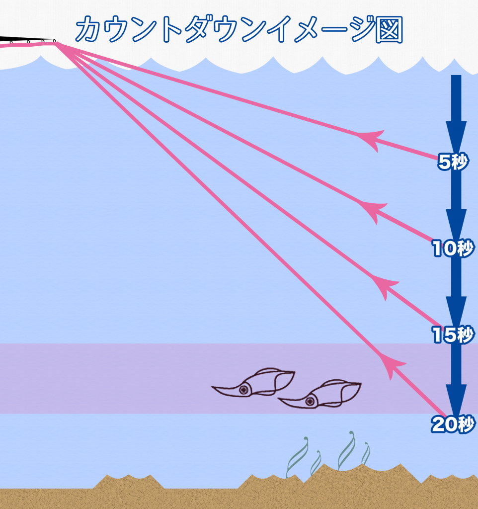 例えば着水から30秒で底につく場所なら上から5秒でしゃくり始めて釣れれば表層にイカが浮いているし、25秒でしゃくり始めないと釣れないなら底近くにイカがいると判断できる。基本底付近にいることが多いアオリイカだが状況によっては表層にいることもあり、カウントダウンで状況を探るのは重要である。