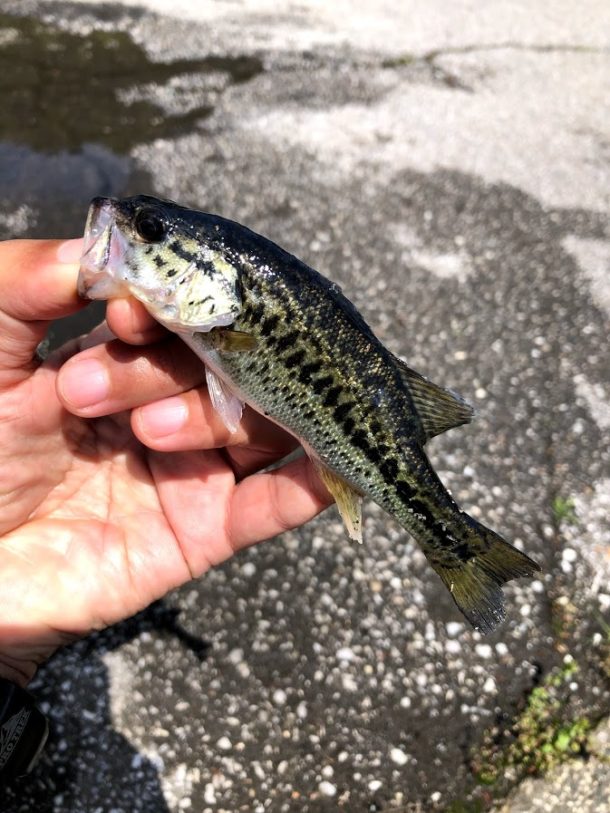 昼飯を買って食べて、午後の釣り場を探して移動していたらなんとなく、風裏になっていて小さな河川が流入しているポイントを発見。とりあえずちょっと様子を見に行くと、船着き場のところに大量の豆バスが見えた。