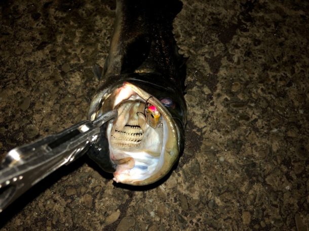 この魚をヒットさせた時、ゴン!ってきたあと、またゴン!ってきて、更にグググ!って感じで2回も前アタリがあった。こういう時って大体の場合、他に魚がいて、奪い合う形でルアーを追ってきてるので一匹釣ってもまだまだ同じ場所で釣れる可能性が高い。