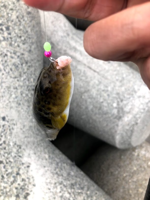 アタリはあるけど釣れない状況がずっと続き、夕方になってきたころ明らかに持っていくようなアタリが来たので思い切りフッキングしたらフグが釣れた…。