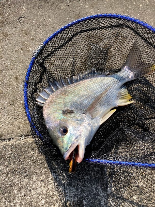 ナイスな引きを楽しんで上げて来たのがいいサイズのキビレ。シャワーブローズをガッツリ吸い込んでいた。まさに本気食いって感じである。