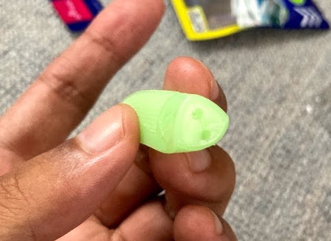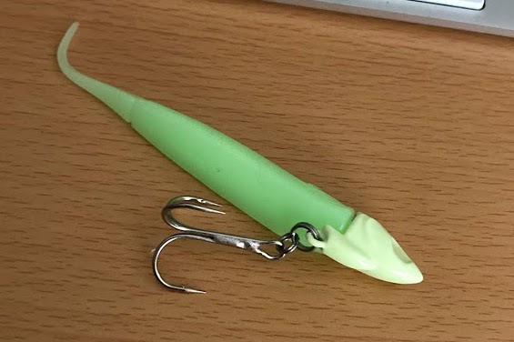 ワームにはジグヘッドに刺すための穴と、ケミホタルを刺す穴が2つ空いており、かゆいところに手が届く仕様となっている。本当に釣り好きの開発者の仕業としか言いようがない…。