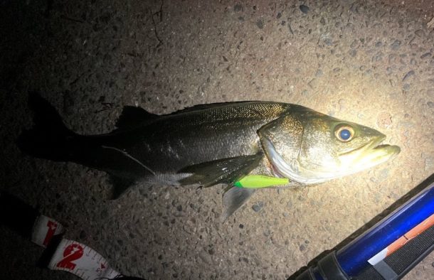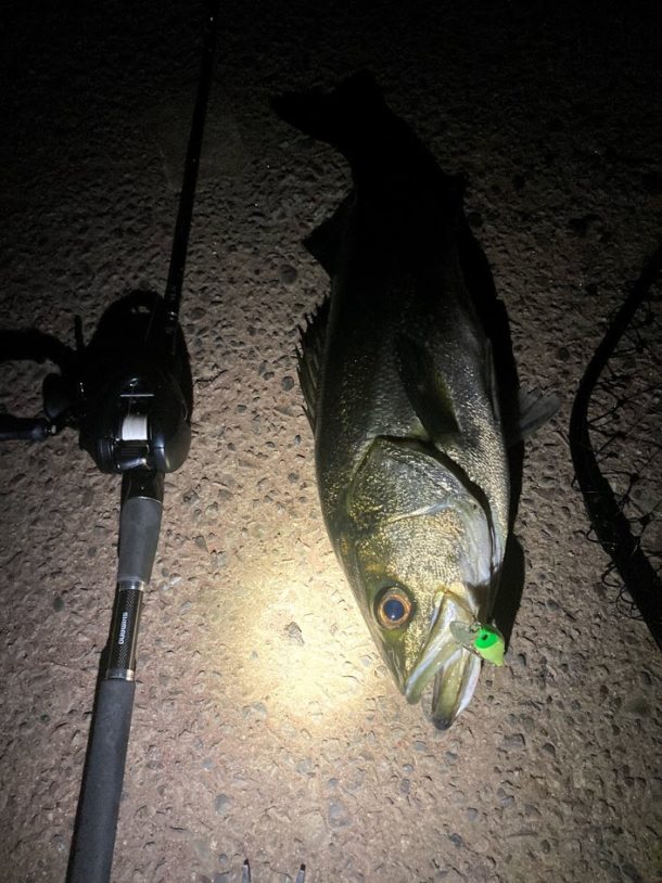 もう無理かな?十分釣ったし帰ろうかな?と思いながら遠投してライトの届くギリギリの距離を攻めるとヒット!足元の明暗からは魚がいなくなったがこのライトから去ったわけではなく、ライトの当たるギリギリの距離の辺りをベイトがうろついているような感じなのかもしれない。