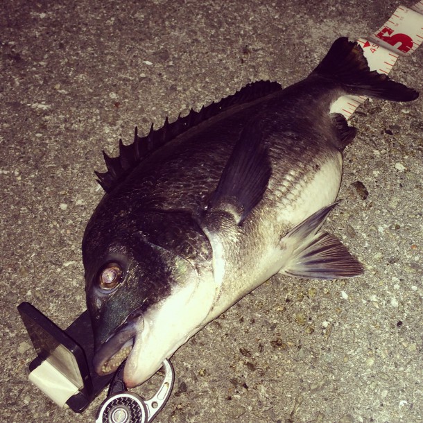 ぶっちゃけ秋のシーバスシーズンなのにチヌやりすぎててリーダーが8ポンドだったわけだがこのサイズの魚が連発するとマジで切られる可能性が高い。ドブ川には障害物が橋脚ぐらいしか無いので切られる事はほぼないと思ったのだが調べてみたらかなりリーダーが弱っていてドラグ緩めじゃなかったら切られていたぐらいボロボロになっていたので16ポンドにチェンジ。