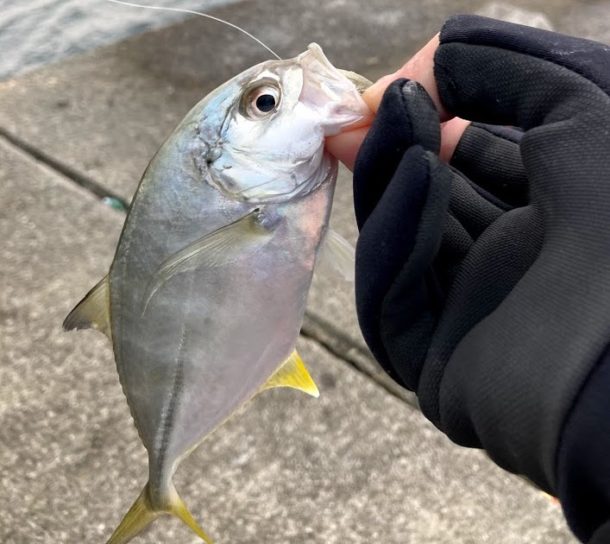 なんとか2グラムのジグヘッドを使って釣りを開始するがすぐにメッキアジゲット。