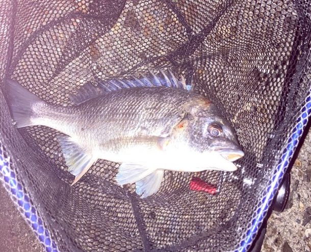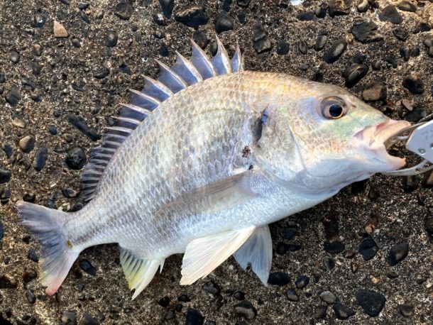 その次の一投、釣れた場所と同じようなところに投げたらいきなり根がかり…かと思ったらヒットしていた!フォールで食ったのか?また同じようなサイズの同じようなボロボロボディーで意外と元気なキビレだった。