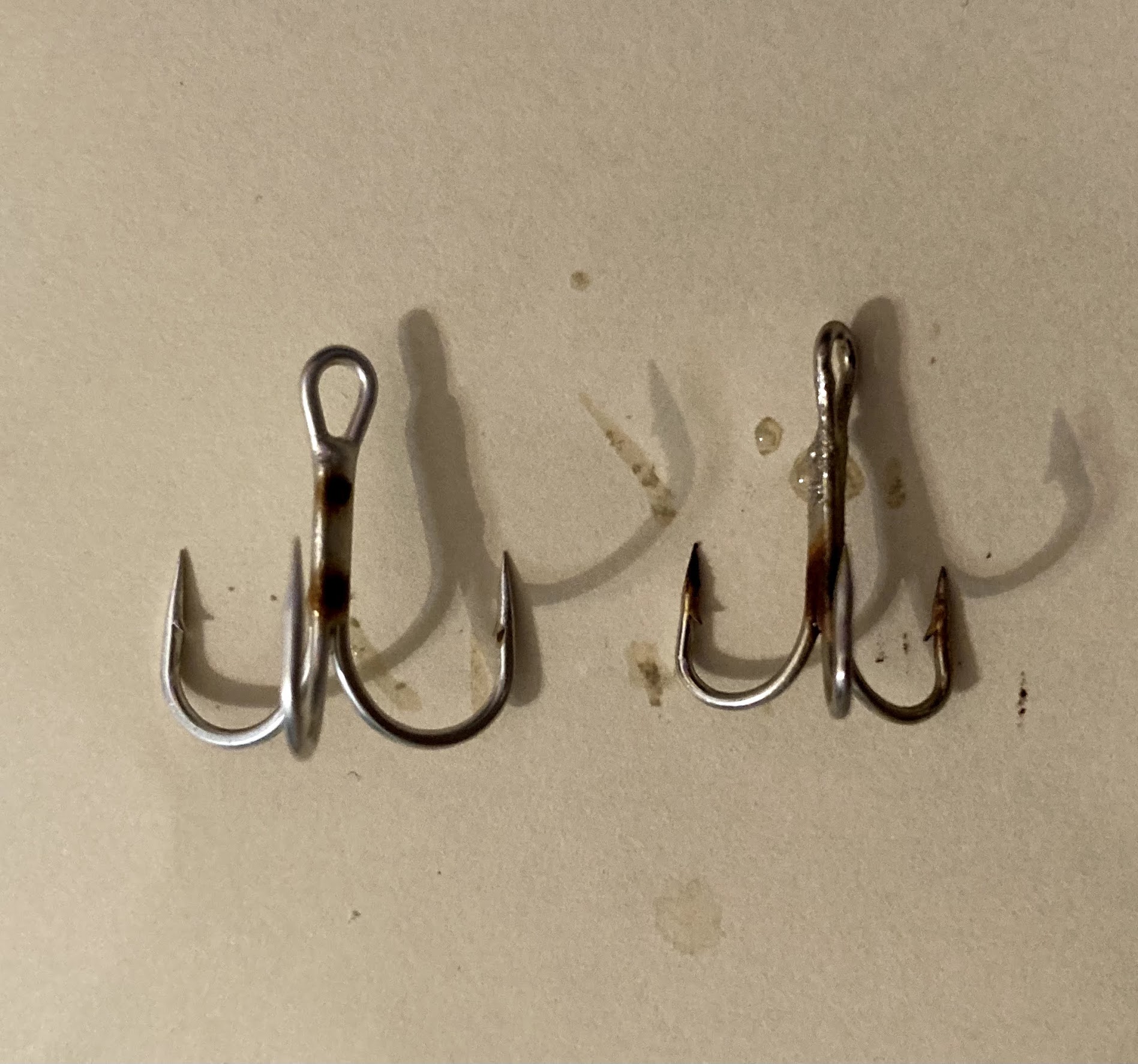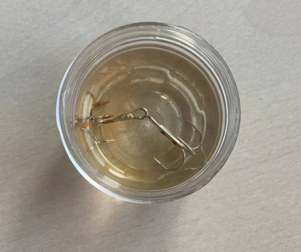 対比としてダイソーメタルジグに元からついていたフックも同じ様に浸けてみたのだがこちらはあっさりと針先、返し、つなぎ目というよく錆びる部分が錆びたのでやはり新しい方トレブルフックはものすごく防錆能力が上がっていると見て問題ないだろう。