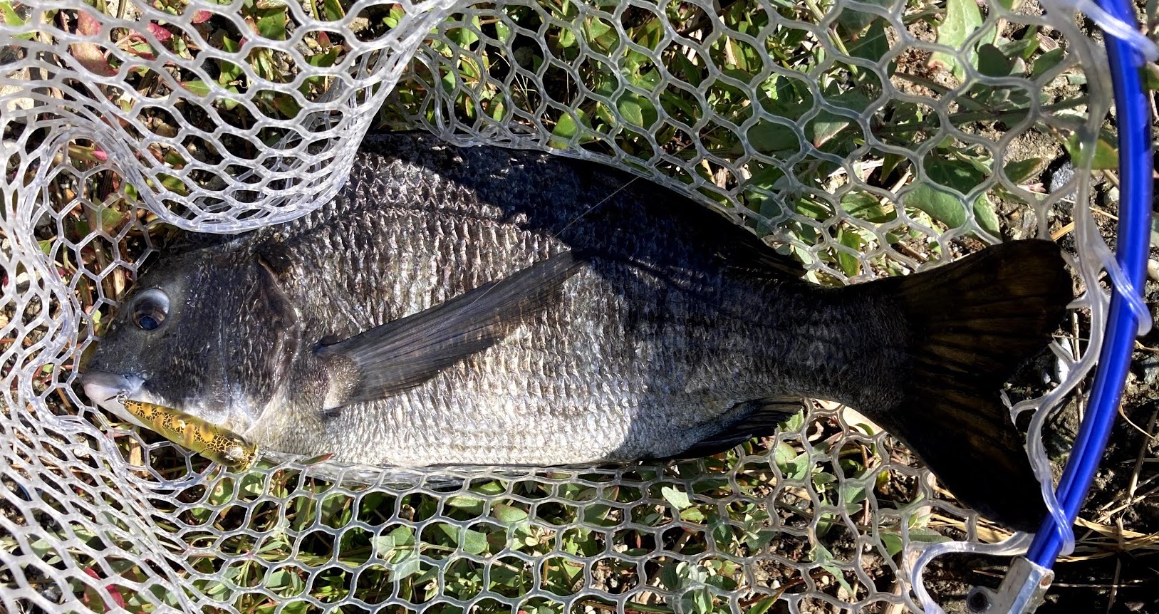日も高くなり武庫川は出ない!と見切りをつけて運河へ移動。岸際をみるとチヌがたくさん見えた。岸にべったりくっついてカニやらフナムシやらが落ちてくるのを待っている感じだったので岸ギリギリにルアーを投げてみる。