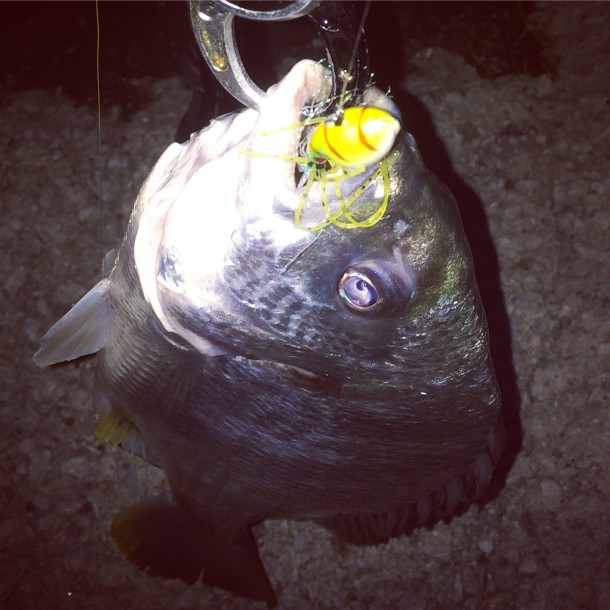 無茶苦茶いい引きの魚で沖に泳ぎまくる。ドラグ出しまくってどこに行く!ってぐらい引きまくったがやっと足元まで寄せてきてかなりナイスサイズのキビレだと確認出来たが一気にここで最後のダッシュ!そのままルアーが外れて泳ぎ去ってしまった…。