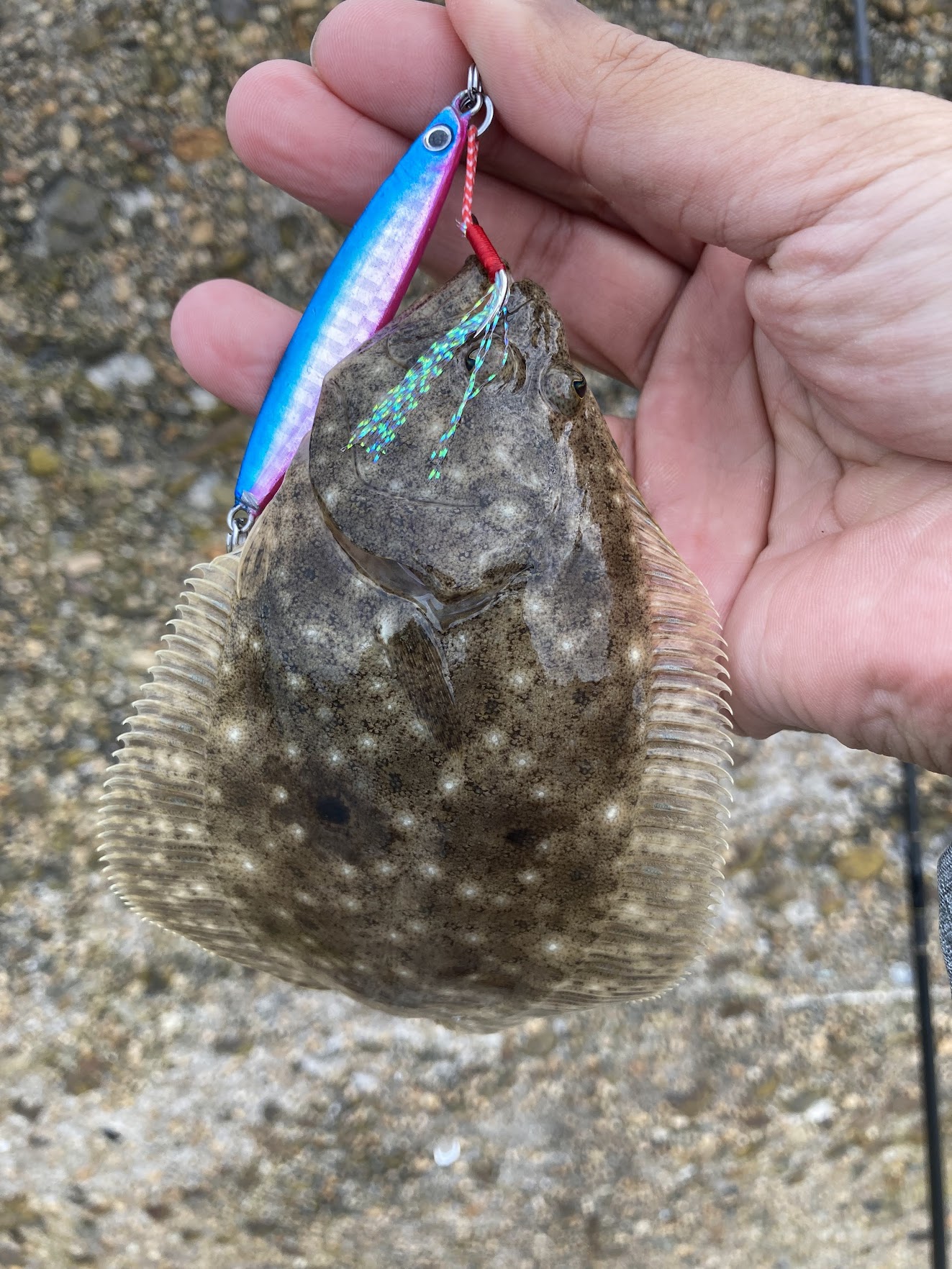 割といい引きでそこそこ竿が絞り込まれる。いい型のエソとかかな?とあまり期待せずに寄せてきたが足元でヒラメだと判明!マジかよ!40センチぐらいのヒラメがダイソーのジグサビキで釣れちゃうんかよ!と驚きすぎてちょっと慎重にあげようとイカ用のギャフを出そうとしてもたついていたら外れて逃げていってしまったのであった…。あのサイズなら美味しくいただけたのに…。ジグサビキのハリス掴んで引っこ抜けば良かったなぁ…。
