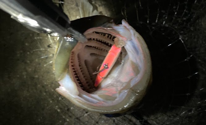同じところ通したらまたヒット!これも同じぐらいいい引きするやん!腕疲れてるのに!って感じでちゃんとやり取りして浮かせてネット用意してってところで水面でエラ洗いして勝手に外れてさようなら。