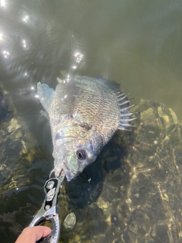 全体的に武庫川という川は浅いので魚がいるかどうか目で見てわかるのだが、全くチヌを見かけない日がないぐらいには常にストックされている。