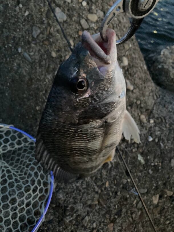 必然的に人が少なくなり、おそらくシーバス狙いのルアーの人と前打ちのチヌ釣り師はいたものの、ぶっこみ釣りのおじさんがいなくなったことでチヌのストック量が増えているわけだが予想通り着いて10分ぐらいで釣れた。