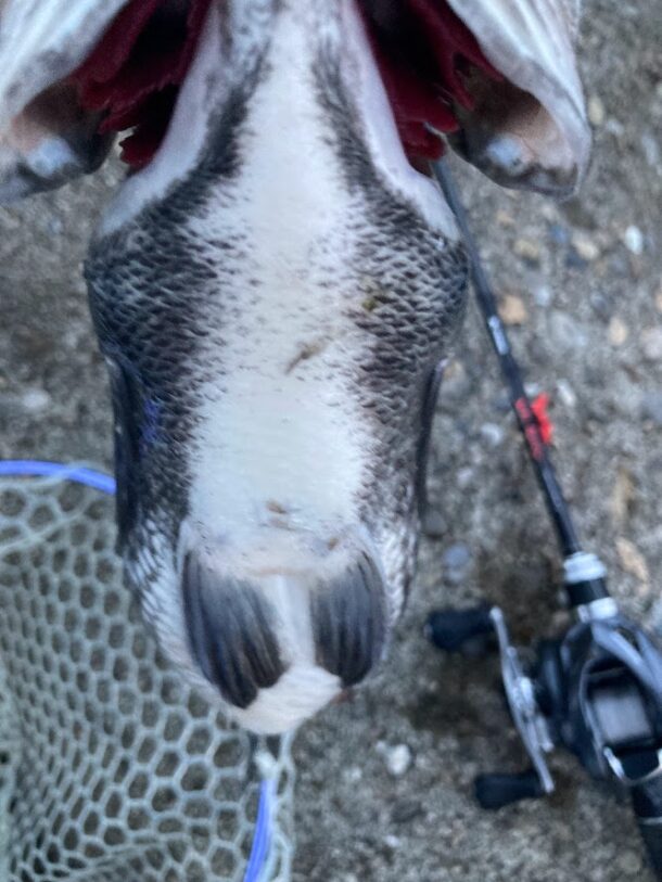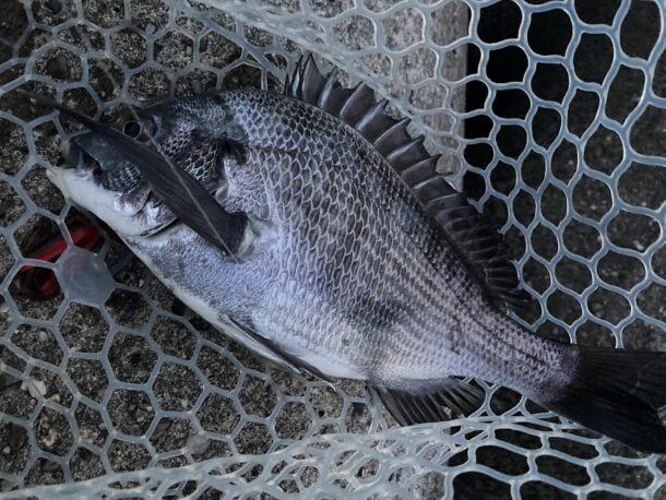 しかしすぐに次の魚がヒット。この魚も非常にいい引きだったが先程のビッグママよりもだいぶ小さいスモールママであった。このサイズでも腹パンパンの乗っ込み黒鯛というのは面白い。