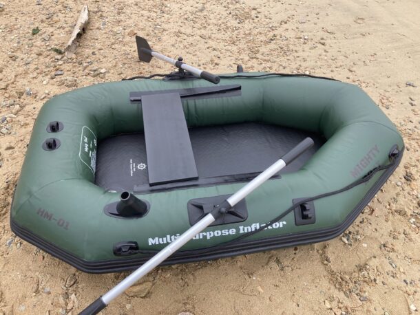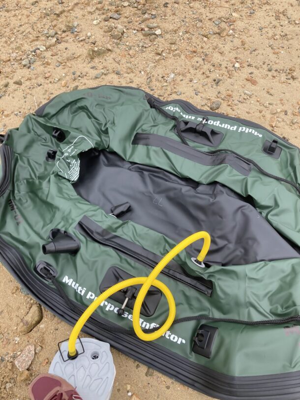 空気を入れる時間は5分ぐらいで完了するレベル。気室が前と後ろに分かれているのでフックがぶっ刺さって沈没しても普通に浮くので少し安心。更に底板も空気を入れるのでナイフで3つともぶっ刺すという狂気に満ちた行動をしない限り完全沈没はしない。