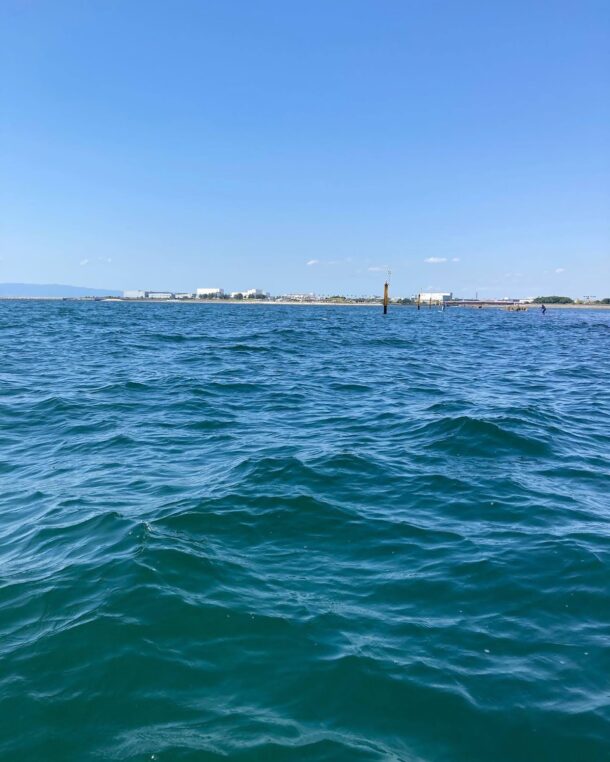 とりあえず貝塚人工島までボートで移動しようということになり、移動を試みるがちょっと風が強いことで波があり、普通に荒れてる感じ…。