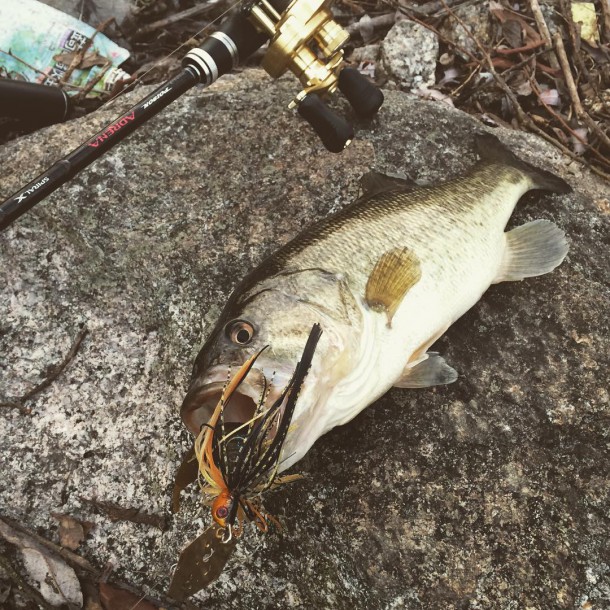 流れ込み下の深みを狙ってみると一投目で当たり。合わせるとそこそこ気持ちいい引きを味わえた。ドラグをユルユルにして小バスと遊ぶのは楽しい。