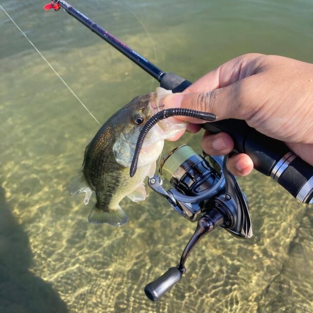 ワームを見えバス対応のOSPドライブクローラー3.5インチという小バスでも難なく食えるサイズで狙う。