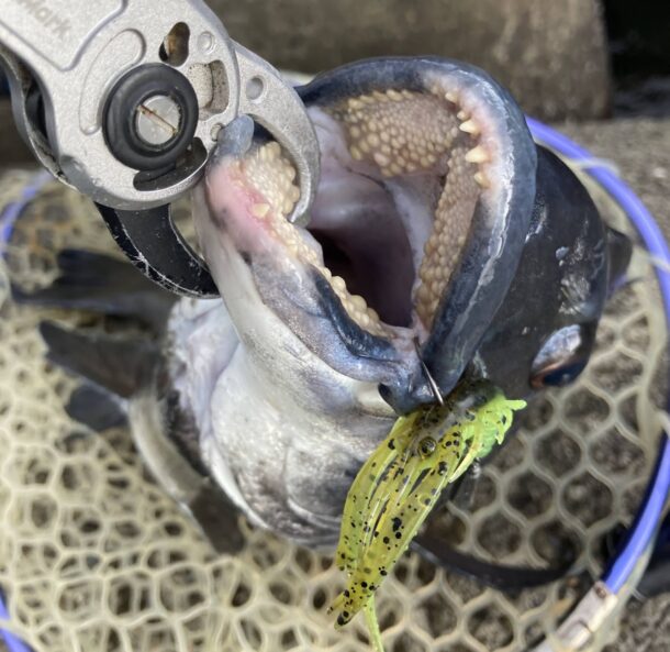 ただ、魚の気配は無いのでちょっと移動して流芯の方を攻める。ワームは最近買ったアーバンシュリンプにチェンジしている。