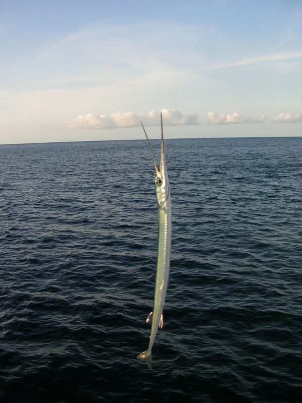 しかしこの後はルアーでは流石になんも釣れなかったので落ちてた干からびたオキアミを使ってなんか釣ろうと頑張ってみる。水面を泳いでいたダツの目の前にうまく落とし込んだら釣れた。