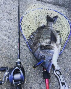 移動しようかな?と思っていたら足元まで来たルアーの後ろの結構でかいチヌが見える!と思ったらいきなり食った!こんなに近くで食って乗る?と思ったけど運良く乗ってむちゃくちゃ引く!