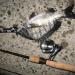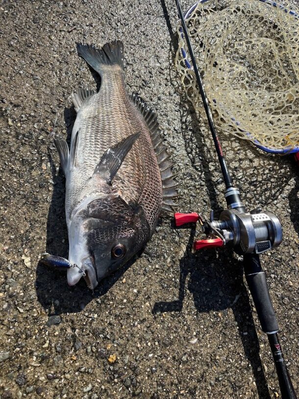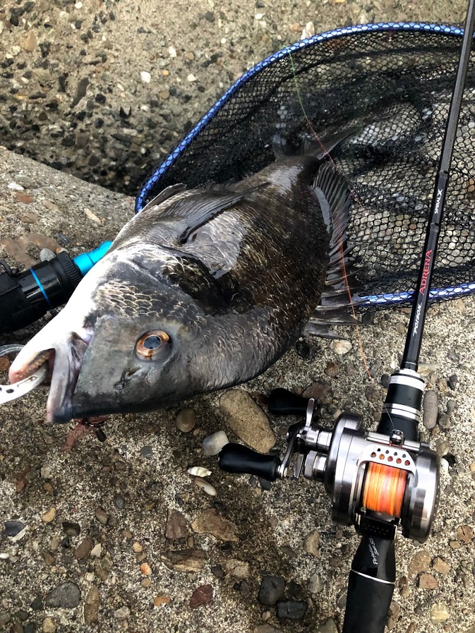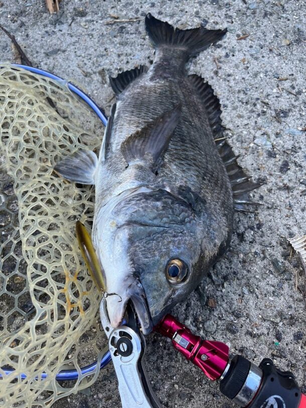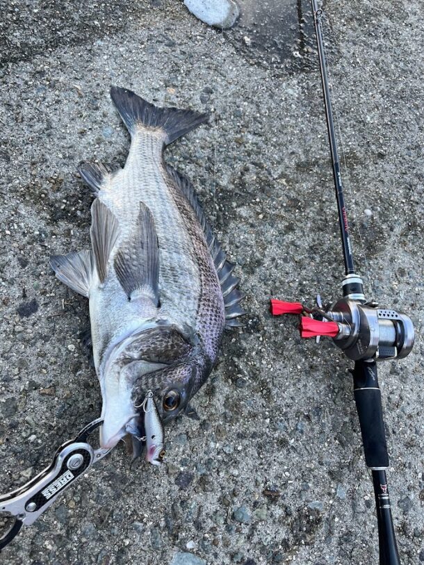 ナイスなサイズのチヌ。引きが強すぎてレッドペッパーベイビーの後ろのフックが折れたのでルアーチェンジ…。