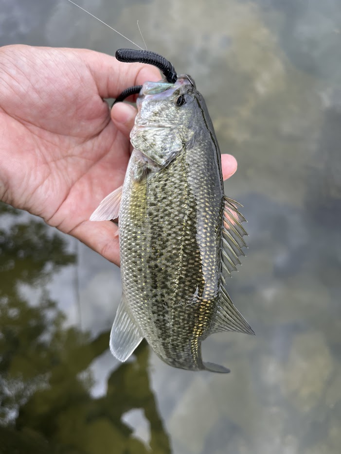 もう一ぴきぐらいブルーギルを釣っとこうと投げたドライブクローラーで小バスが釣れた。