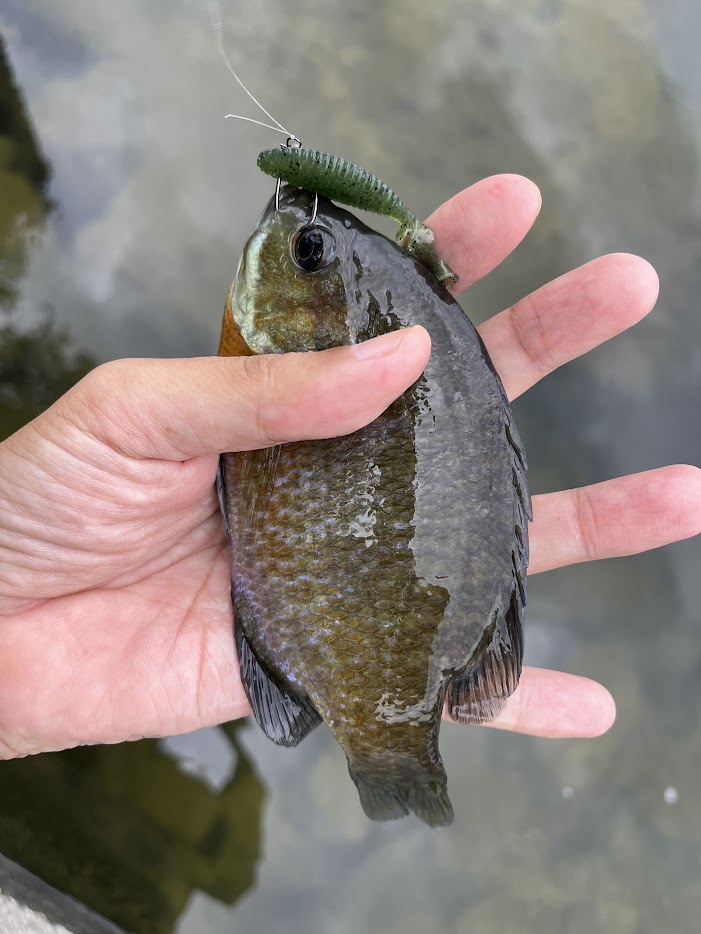 この後はブルーギルの大群が押し寄せてきたのでしょうがなくブルーギルを釣って釣り欲を満たそうと頑張る。ワームを通すといい感じのブルーギルゲット。バスと比べると全然引きが無いのでつまらないが釣り欲はなんか満たされた。