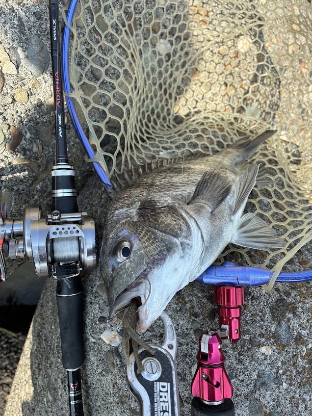 数投目でなんかあたった気がしたボラかな?と思ったけどもう一度同じコースを通してみるとコン!と来た後ちょい待ちしてたら更にコンコンと来たのでボラではないと合わせるとヒット!なかなかの引きで根にこすられまくったもののなんとかゲット。ラインがかなりボロボロになってしまっていた…だからテトラ地帯ではリーダーかなり長めじゃないとだめなんよね…。