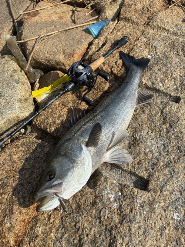 やっぱりサバはいないみたいで当たりは特に無い。群れがいるゾーンを通して見たらでかい魚が食ってきた!かなりいい引きで楽しめたのがデカシーバス。