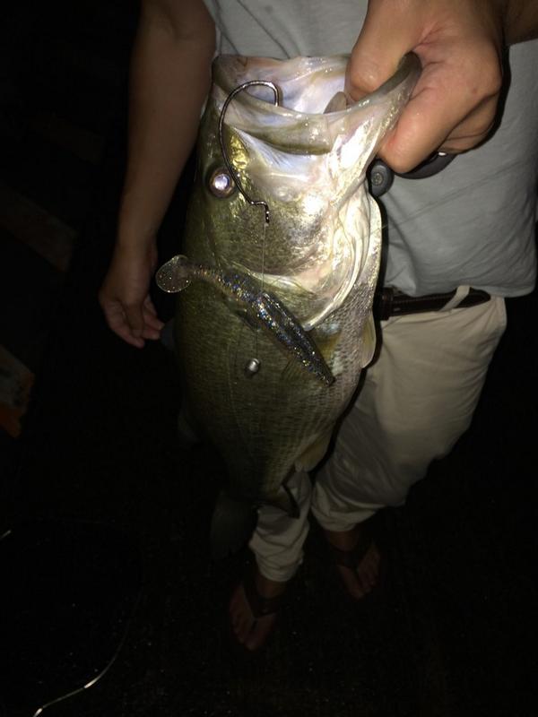 一投目でバイト。コツンと来たのでスモールだったら4インチシャッドシェイプをマス針部分まで食えてないかな?と思いつつスイープにあわせを入れると乗った。