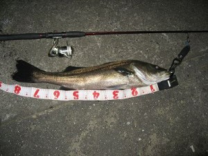 と思っていると後輩がついに40センチ級のセイゴをゲットしてボウズを逃れた。