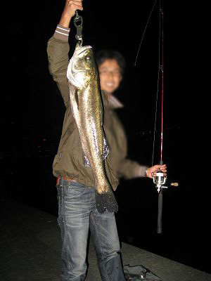 結構いいサイズのシーバス。このシーバスはさっきのものすごい重い引きではなく、シャープな、きれのある強烈な引きで走り回る。