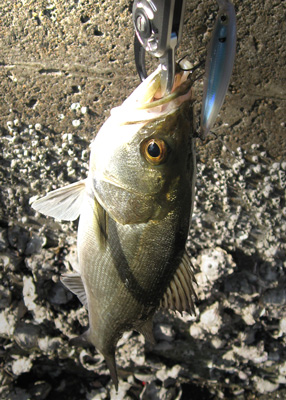 ここはなんか一匹来ると次が中々来ない。かなり時間を置いてワッキー氏ヒット。さっきとほぼ同じサイズのセイゴだったが2匹目ゲットうらやますぃ~。