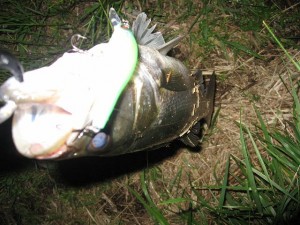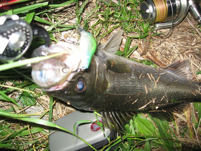 と思い、確かめるために足元まで寄せてライトで確認するとシーバス!!強烈なエラ洗い!で、壁にラインを擦り付け、ぶっちぎられた・・・マジかよ・・・なんだったんだあの序盤の引きの弱さは・・・。