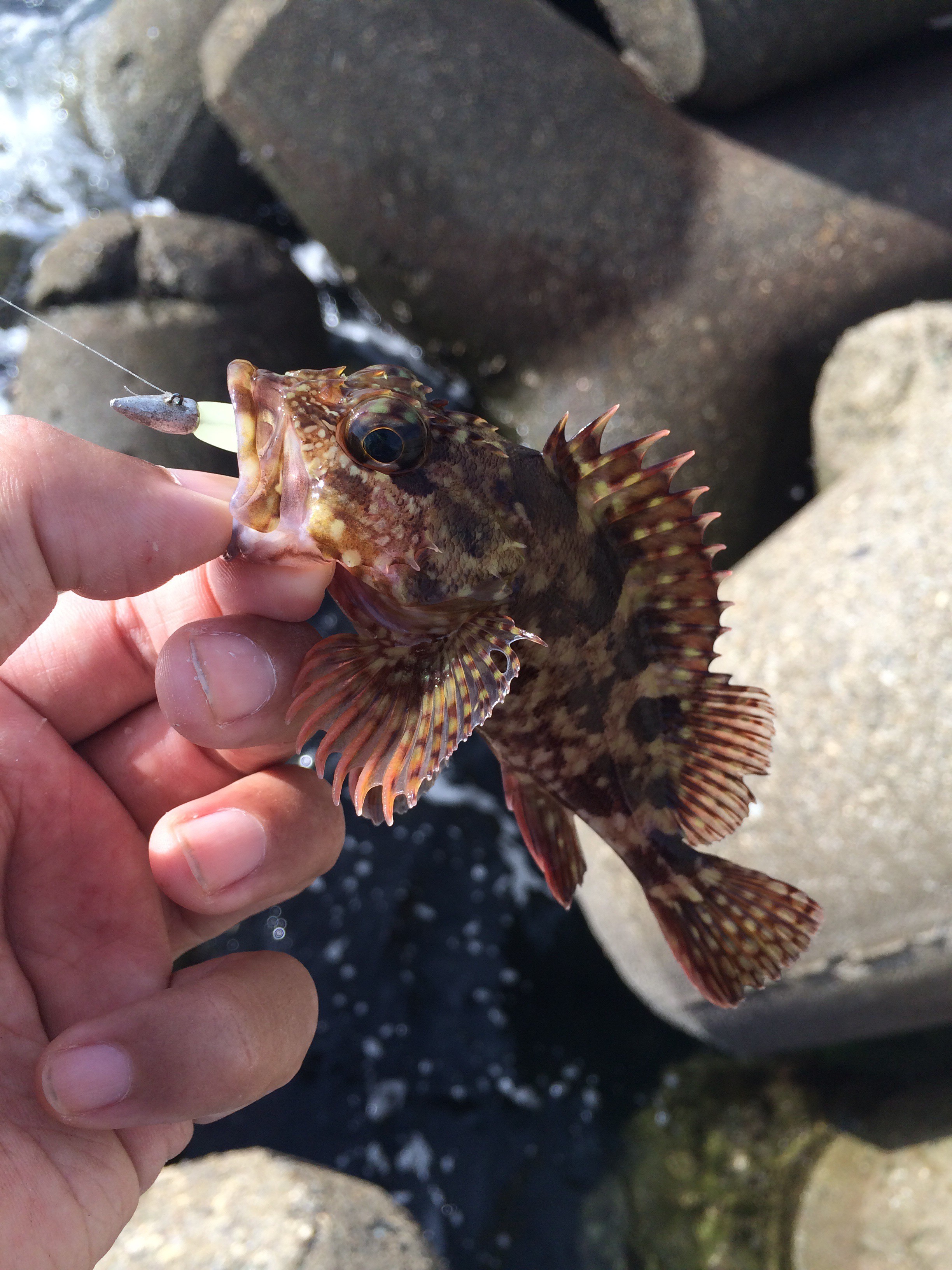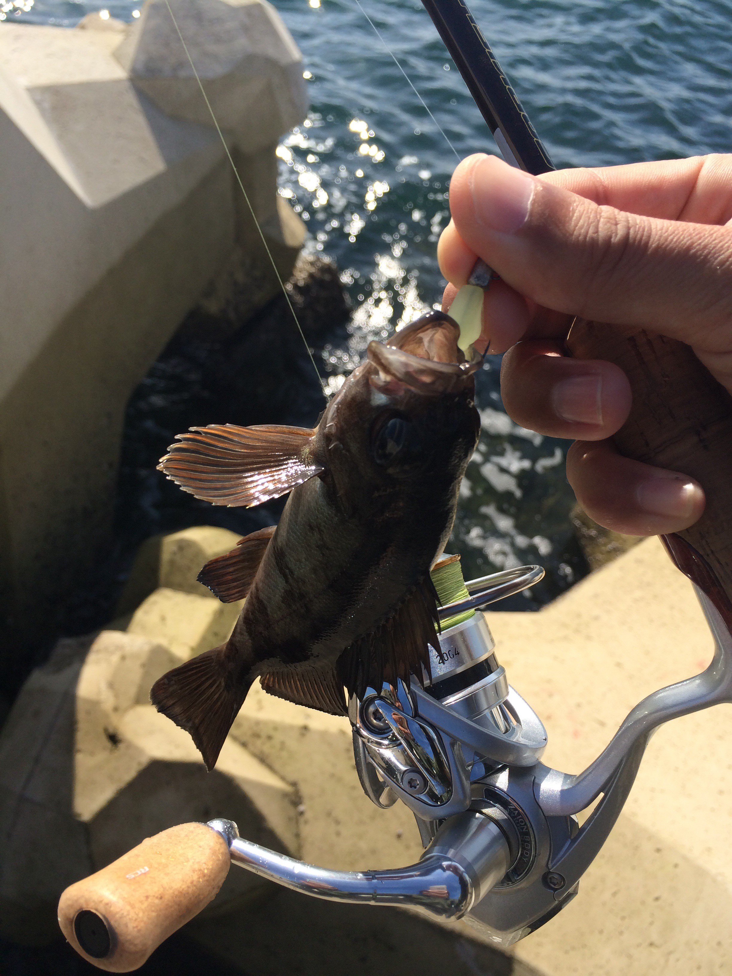 この日釣れる穴は奥の穴よりも海に近い波がガンガン来るような穴が良かったのでそういう穴を集中的に狙いながらやっていると穴というよりは海のテトラの下辺りを狙って落とした時に中々の引きが!