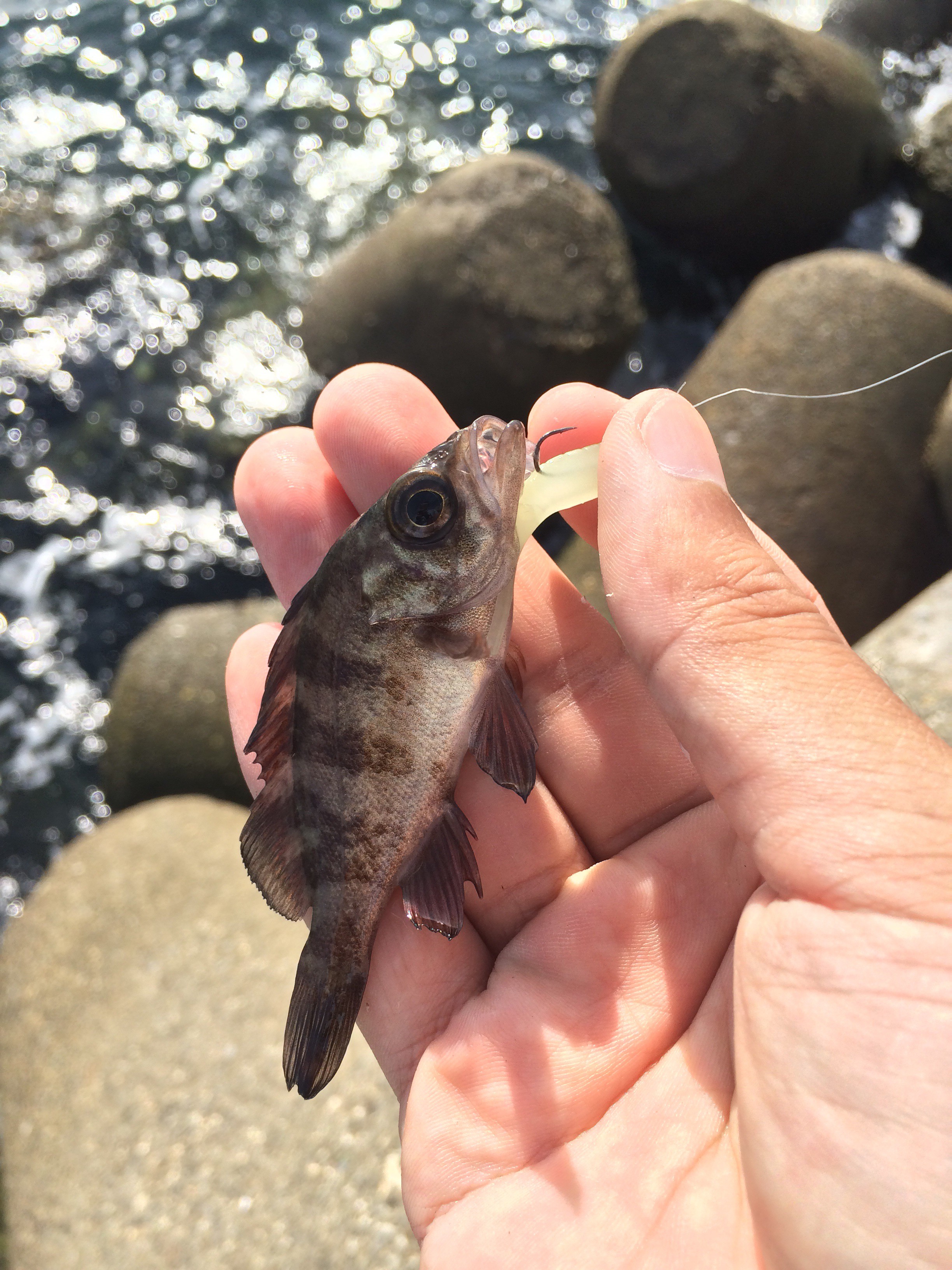 でもメバルが小さすぎて上げてもキャッチする前にポロッと落とす。。9連続ヒットしたけど結局持ち帰り袋に入ったのは1匹だ。。効率悪っ!