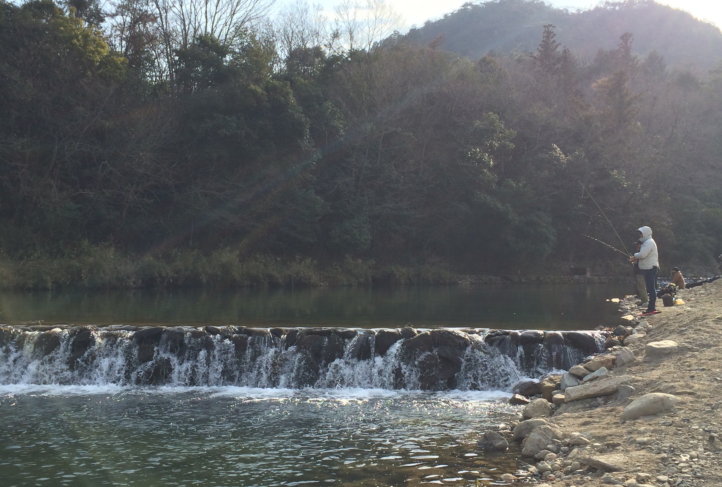 魚影の濃い下のエリア(堰堤で仕切られている)はぎっしりなのでしょうがなく上の場所でやり始めることに。