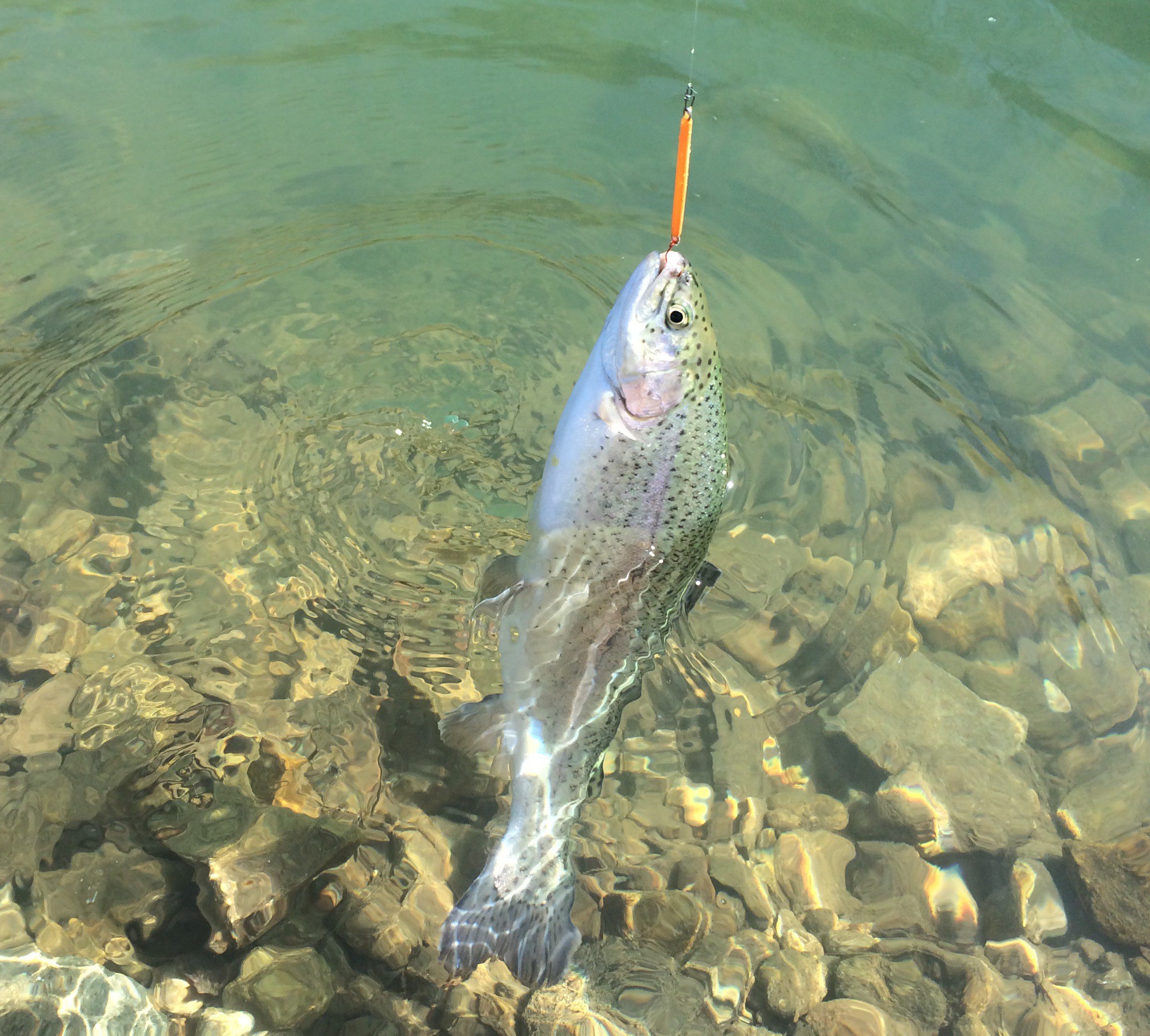 足元に何処からとも無く2匹ぐらいニジマスが回ってきたのでスプーンを通してみる。どうせ食わんだろうと思ったものの喰うのが見えたのでバシ!と合わせてゲット!