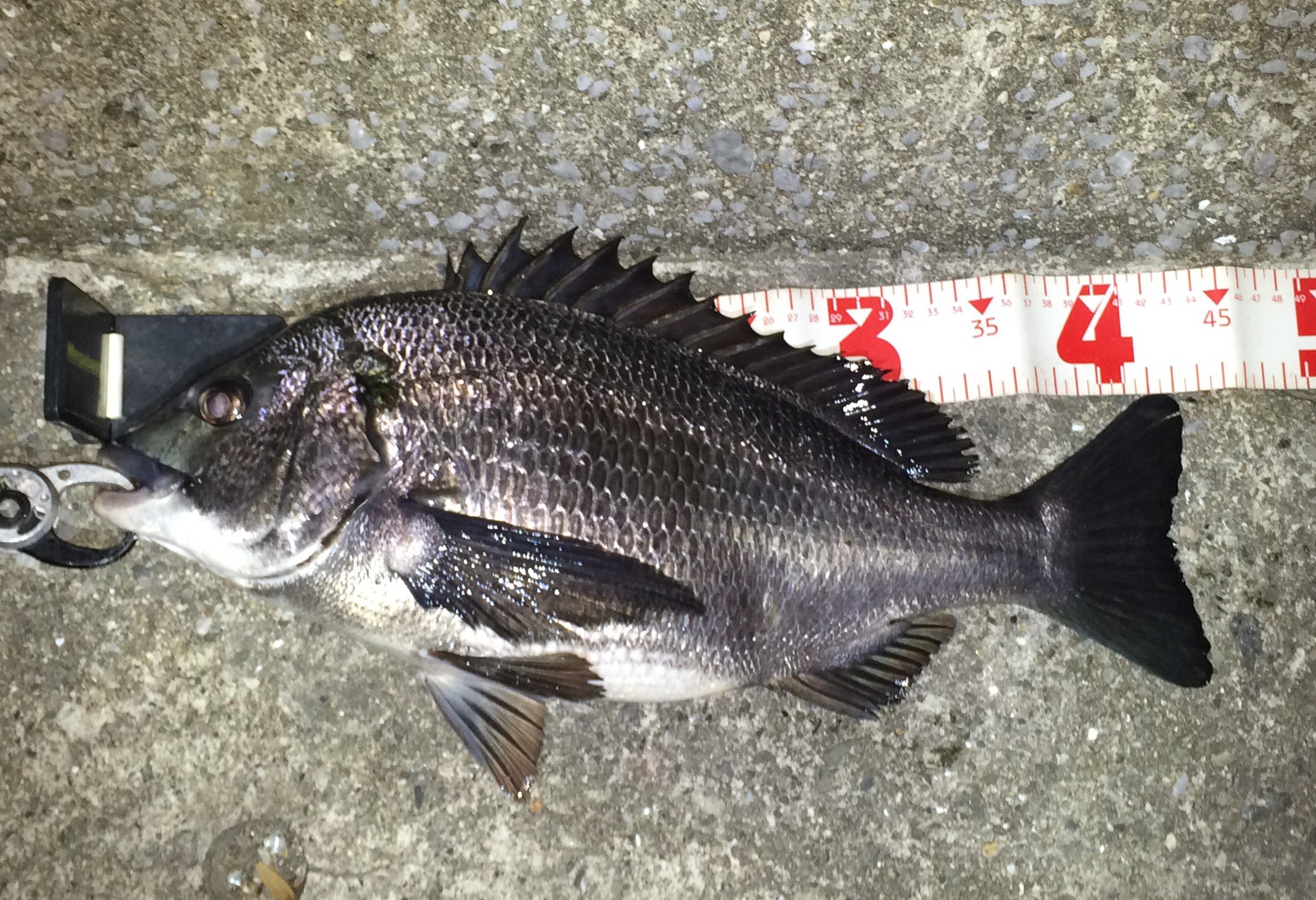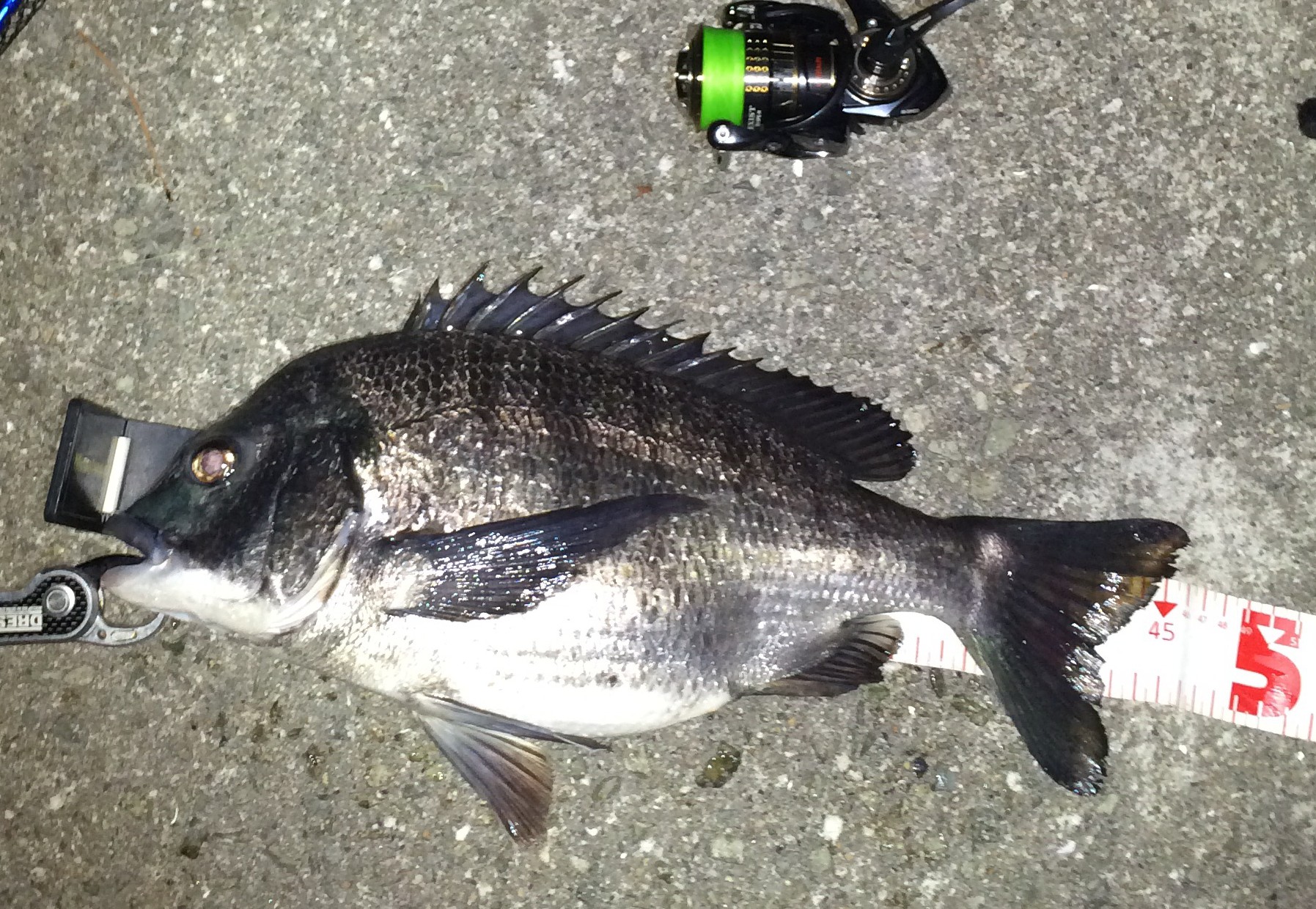 中々サイズだったので年無し行ったか?と思いメジャーを当てるも45センチ・・・お腹がでかくて重さ的には年無し級だったのだが長さは全然足りなかった。。年無しとは50センチ以上のクロダイのことを言う。一度は釣ってみたいサイズだ。