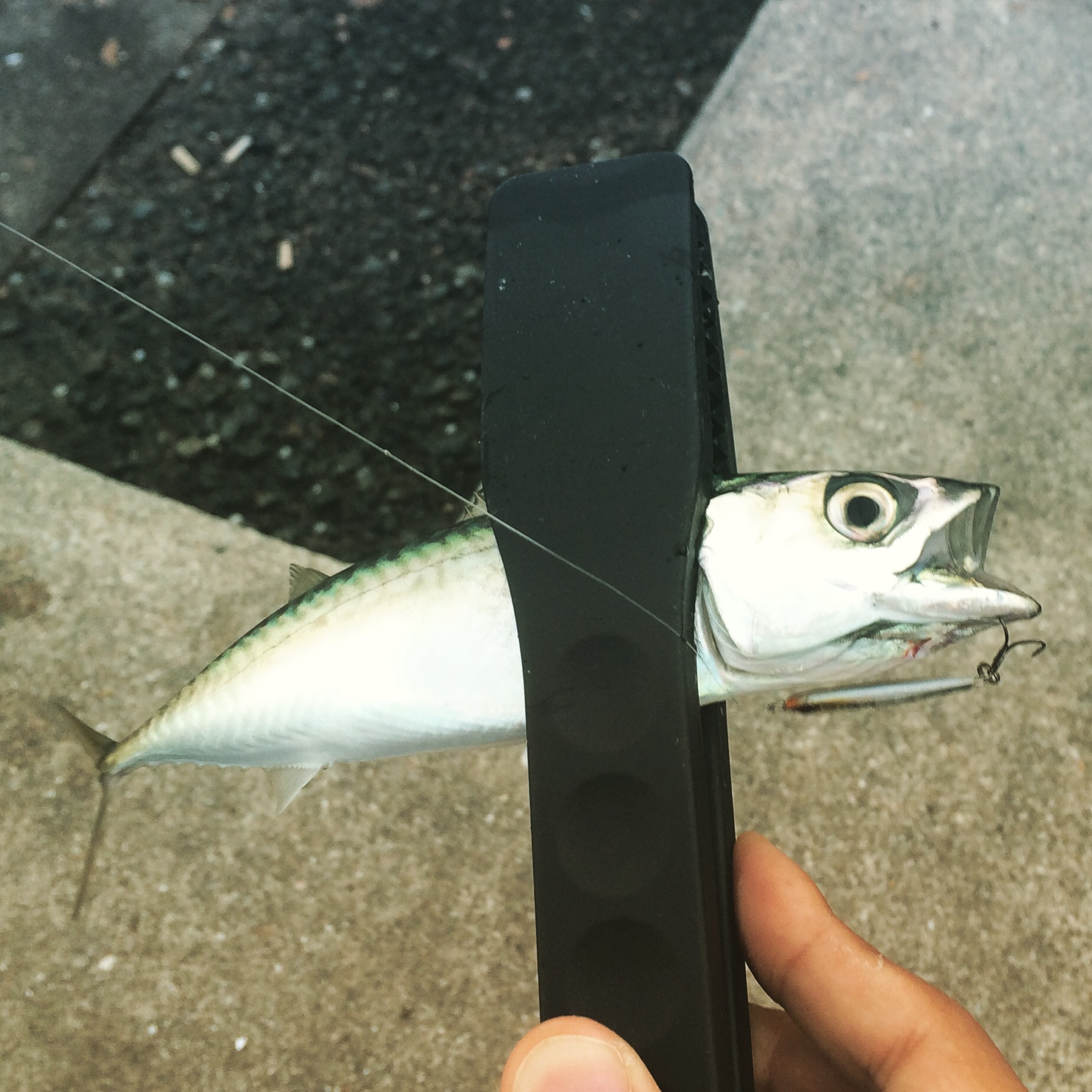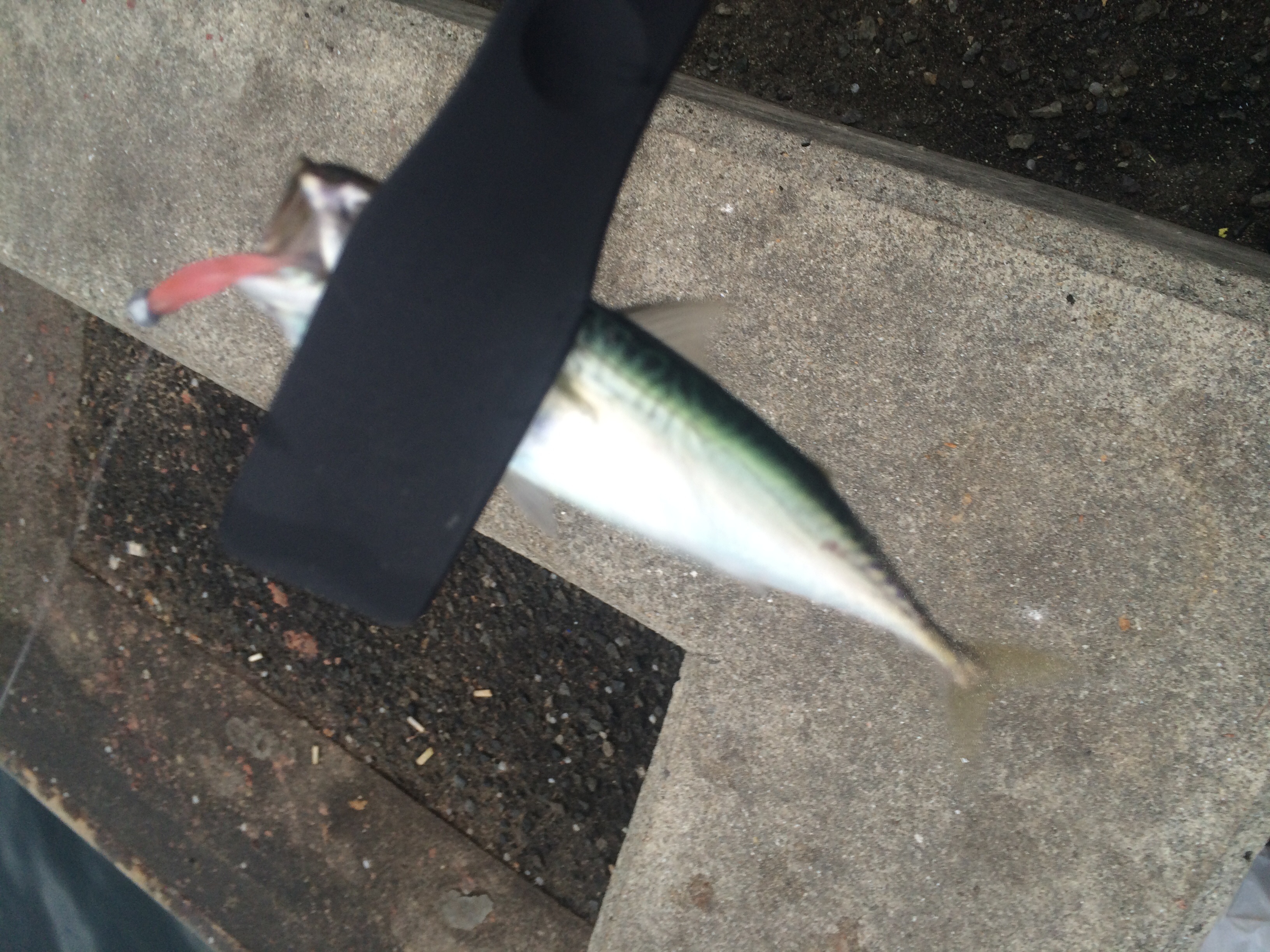 これだけ魚影が濃ければジグでも食ってくるだろうとメタルジグを投げるとすぐにヒット。投げて巻くがアタリがあっても乗らないバイトばかりで結局足元までついてきたサバを足元でしゃくり続けてヒットさせる形で2〜3匹ゲット。