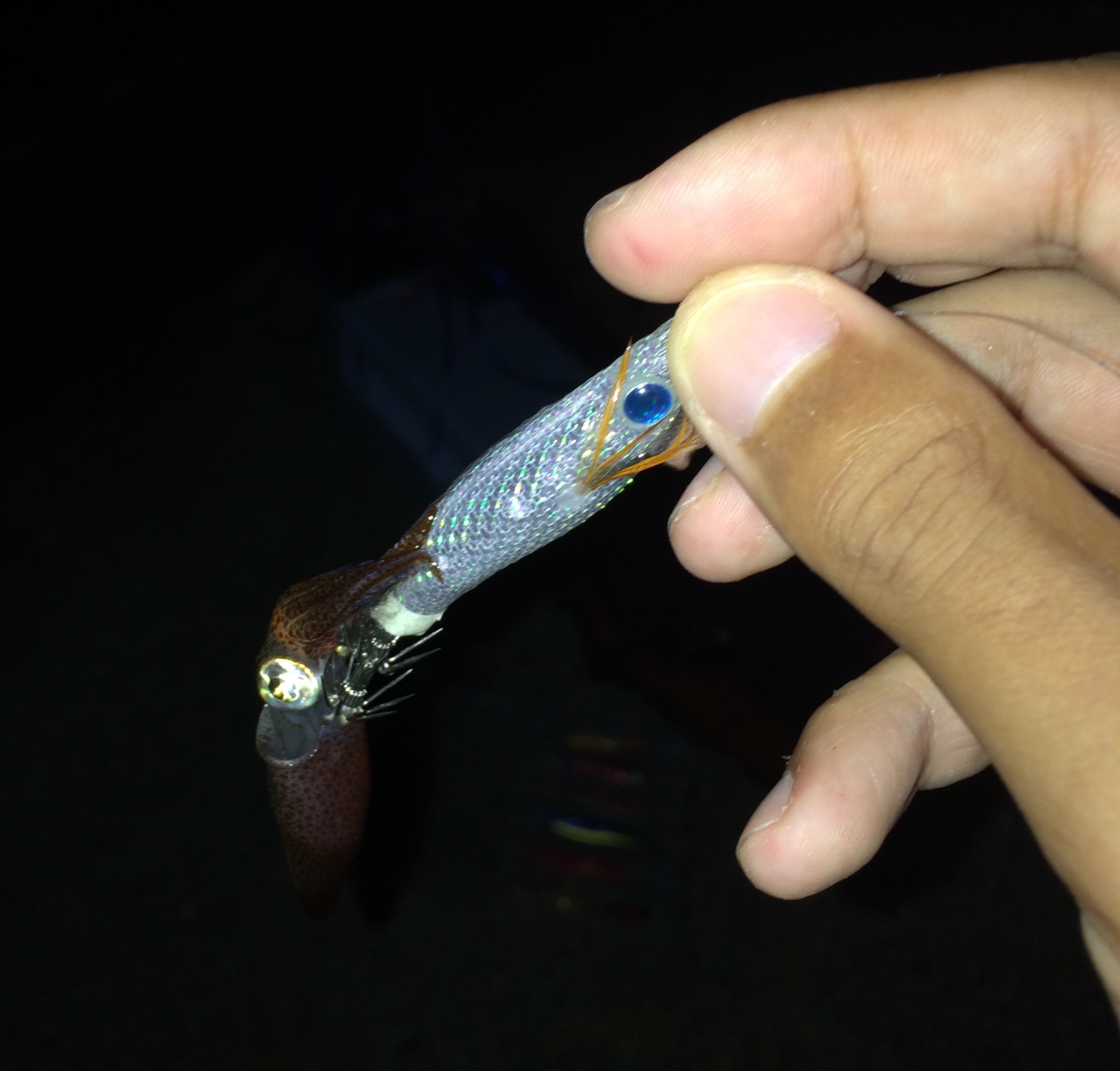 まだいるかな?とエギを投げるとなんか当たる・・・でも乗らない。ゆっくり巻いてくると手前のほうでまたなんか当たるのでちょっと誘いを入れてみた。ちょんちょんとやってフリーフォールさせるとひったくっていったので合わせて巻いてくる。