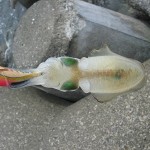 場所をちょいちょい変えながらやってるとラインが変にたるんだり張ったりする。なんだろう?とちょっと誘って送り込むとアタリ!合わせるとちっちゃいケンサキが飛んできた・・・。ちっちゃすぎw