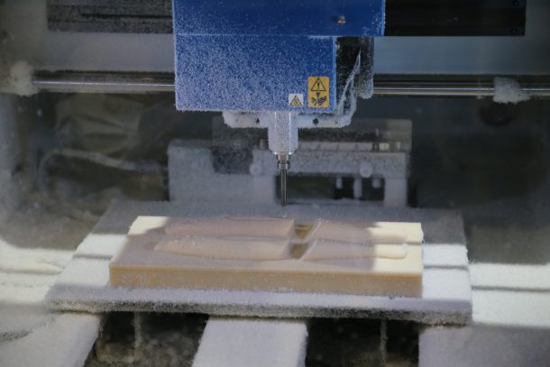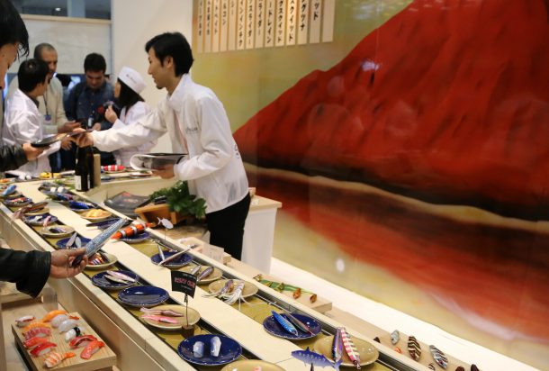 回転寿司みたいに商品が流れてくるという斬新な見せ方をしている。ブース全体のイメージもまさに回転寿司!すごい。
