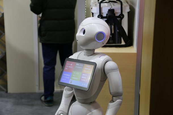 スタッフがペッパーくん。展示会で説明してくれる人もAIの時代なのか。