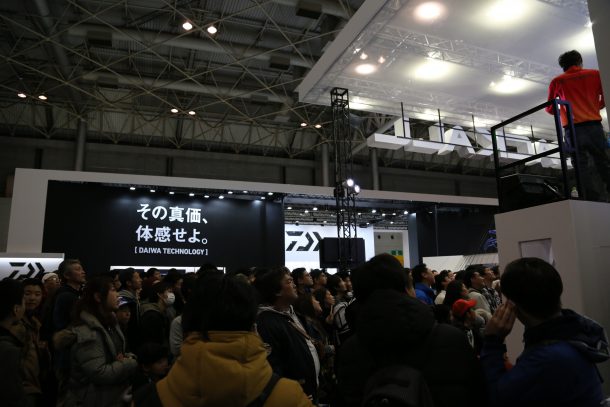 同時刻に開催されていたヤマラッピ氏のエギングトークショーを聞いてた私は向かいのダイワブースから見るしか無いぐらいの人だかりだった・・・。