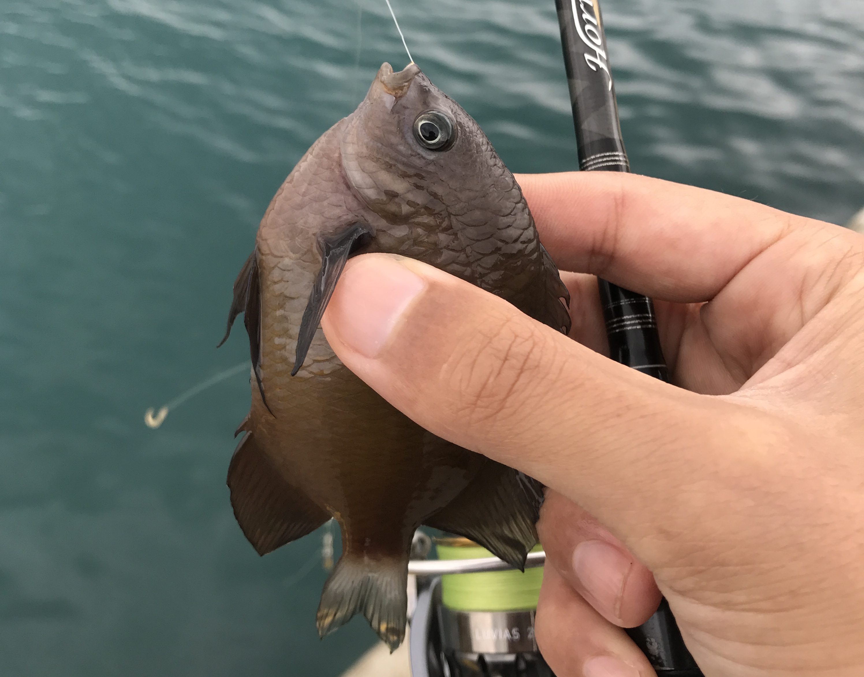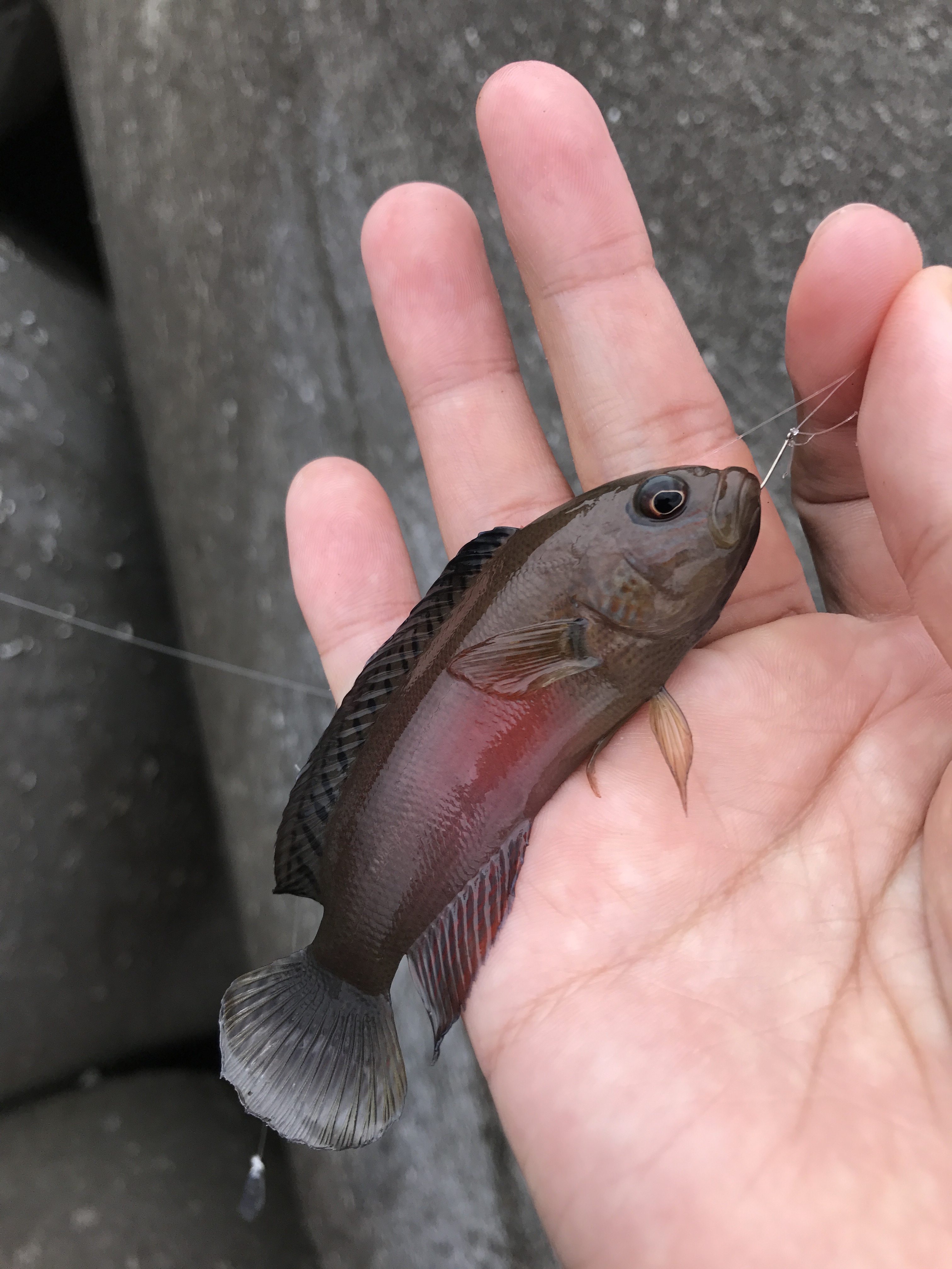 その後はアタリがなくなったのでもう一度最後に熱帯魚を狙うことにしてオキアミを細かくちぎって撒いて、胴付きではなく完全フカセ状態にしたノーシンカーの極小針に餌を付けて狙う。