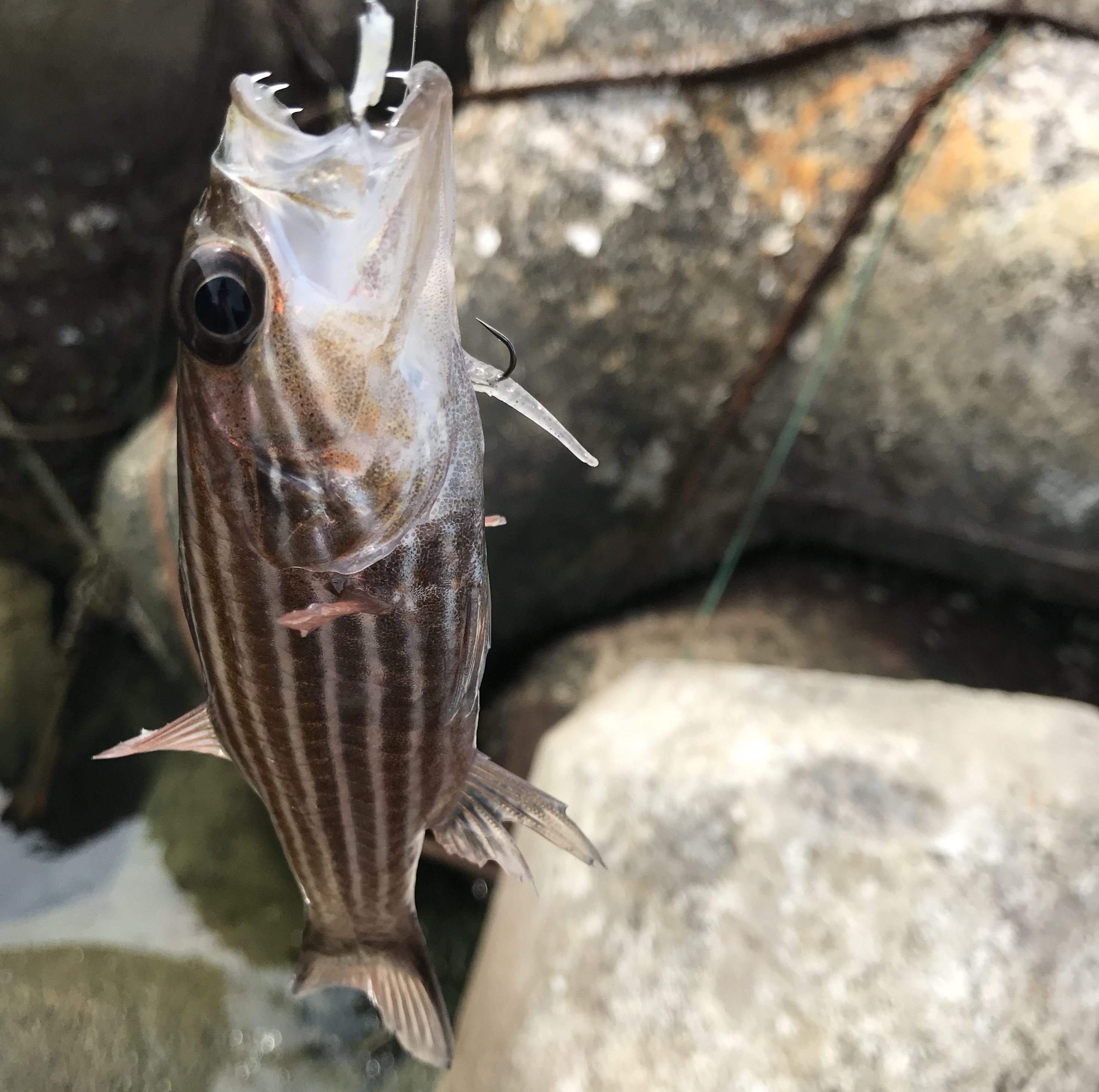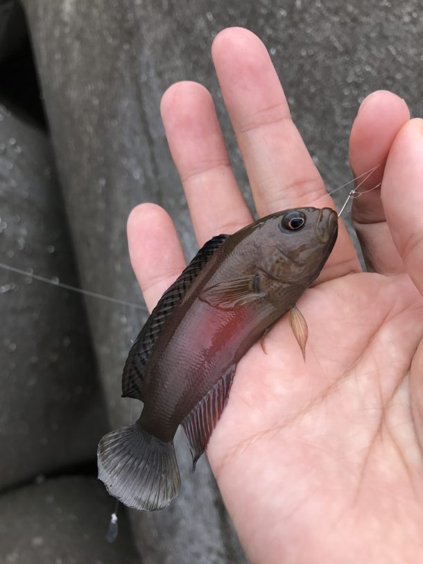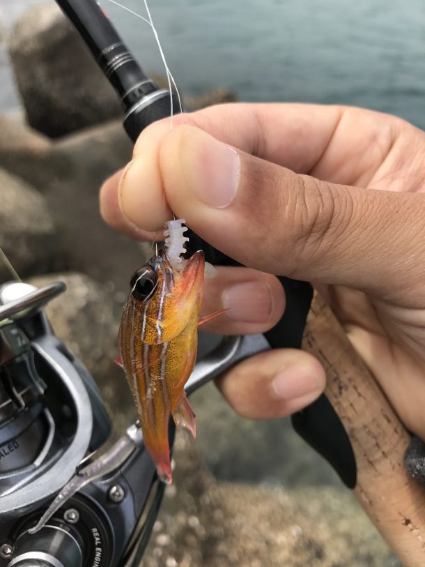 穴にワームを落とすが特に反応はない。偏光サングラスで覗くと何か小さな魚がいるみたいだがかなり小さい。地元に必ずいるガシラやアナハゼみたいな貪欲な魚が全然いないようで寄ってくるけど寄ってくるだけみたいな状況。ただ、カラフルな魚が多いので見てるだけで楽しい。無駄に魚を集めまくって遊ぶが時間が経つだけで何も釣れない。