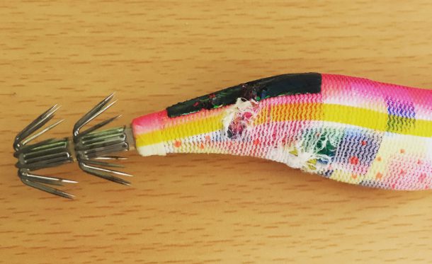 何の反応もない。ダメかとエギをよく見てみるとなんかかじられたあとみたいなのがある。